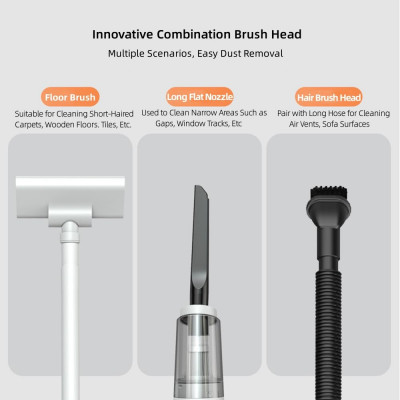 - رؤوس تنظيف متعددة (للأرضيات، الأرائك، الأسقف، السيارات)
